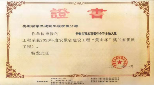 近日,由安徽二建一分公司承建的岳西農商銀行合作金融大廈工程通過安徽省住房和城鄉建設廳專家驗收,獲得2020年度安徽省建設工程“黃山杯”獎。