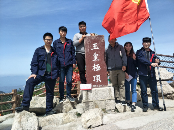 登山小隊在團旗的引領下,從堯山腳下向玉皇山頂進發。登山途中,大家一邊欣賞美麗的風景,盡情享受新鮮的空氣和明媚的陽光,一邊聊天,暢談著戶外活動的愉悅感受。經過近兩個小時的奮進,在不斷的互相勉勵、加油鼓勁下,登上了峰頂,并合影留住這美好的瞬間。