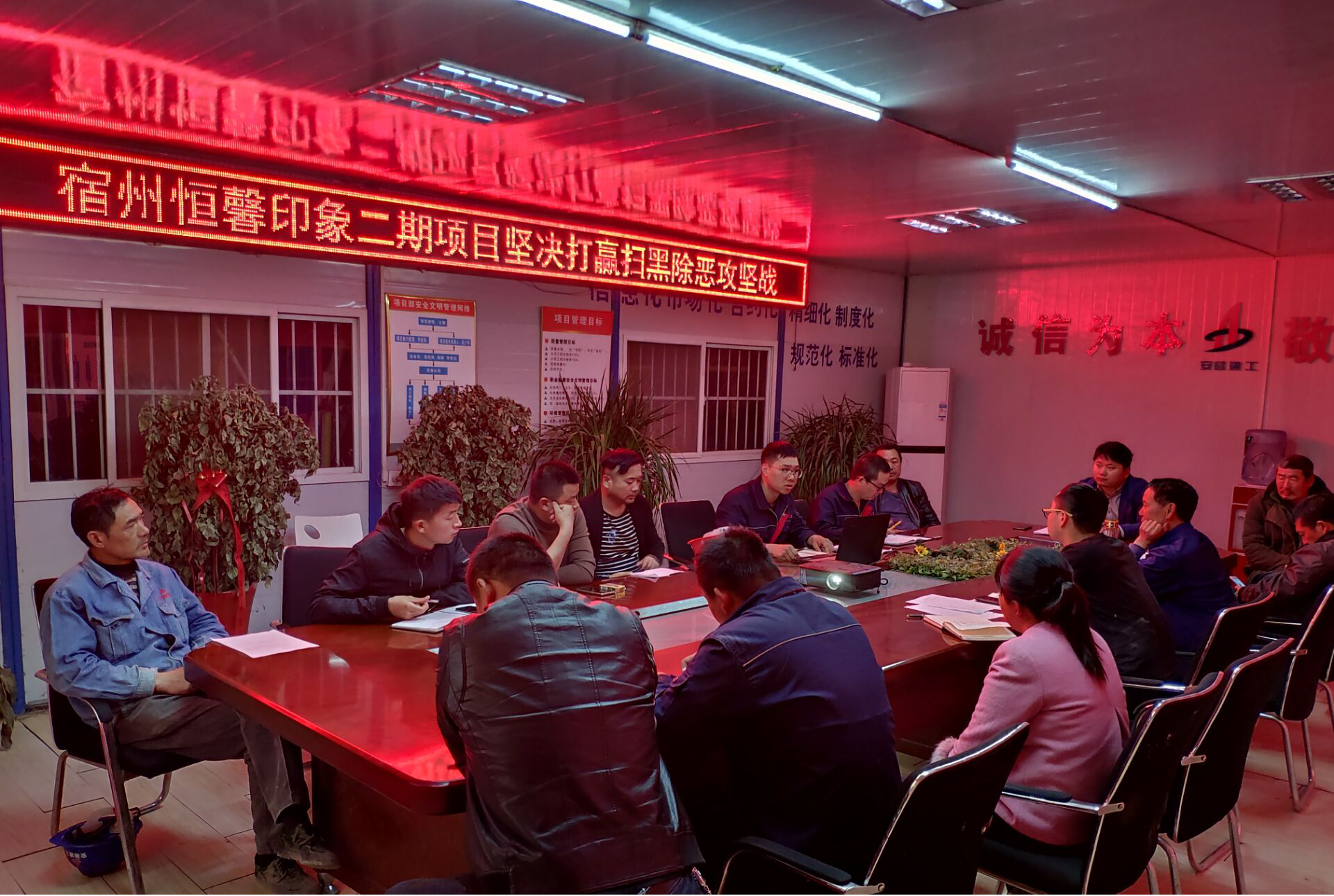 根據公司下發的關于掃黑除惡專項治理行動的通知要求宿州恒馨印象二期項目于2019年4月15日下午利用生產調度會召開掃黑除惡專題會議,進行了工作部署,成立了“掃黑除惡工作領導小組”。小組辦公室設在安全科,項目經理任組長,技術負責人、生產經理任副組長,各科室負責人為成員,切實形成掃黑除惡整體工作合力。項目部通過懸掛橫幅、led電子顯示屏、各樓棟張貼通告、微信群發等多種方式向施工現場人員宣傳掃黑除惡專項斗爭的參與方式和獎勵規定,有效提升掃黑除惡效果,為正常的安全生產保駕護航。