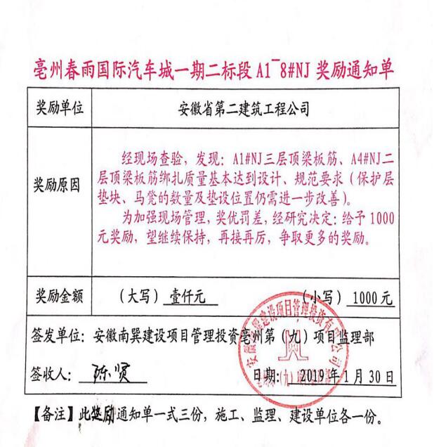 近日,安徽南巽建設(shè)項(xiàng)目管理投資有限公司對(duì)亳州春雨國(guó)際汽車(chē)城一期二標(biāo)段A1#NJ-A8#NJ樓項(xiàng)目的A1#樓三層頂梁板及A4#樓二層頂梁板鋼筋進(jìn)行現(xiàn)場(chǎng)檢查,肯定鋼筋綁扎質(zhì)量達(dá)到設(shè)計(jì)、規(guī)范要求。為加強(qiáng)現(xiàn)場(chǎng)管理,獎(jiǎng)優(yōu)罰劣,經(jīng)其研究決定給予項(xiàng)目部1000元獎(jiǎng)勵(lì)。雖然獎(jiǎng)勵(lì)金額不大,但說(shuō)明了建設(shè)單位對(duì)項(xiàng)目部管理人員認(rèn)真負(fù)責(zé)、一絲不茍工作態(tài)度的認(rèn)可,展現(xiàn)了公司創(chuàng)優(yōu)質(zhì)工程決心,體現(xiàn)了質(zhì)量為本的生產(chǎn)管理理念。項(xiàng)目部將繼續(xù)努力,從小事做起,從管理好現(xiàn)場(chǎng)做起,從保證安全質(zhì)量做起,發(fā)揚(yáng)安徽二建“團(tuán)結(jié)、拼搏、求實(shí)、創(chuàng)新”的企業(yè)精神。